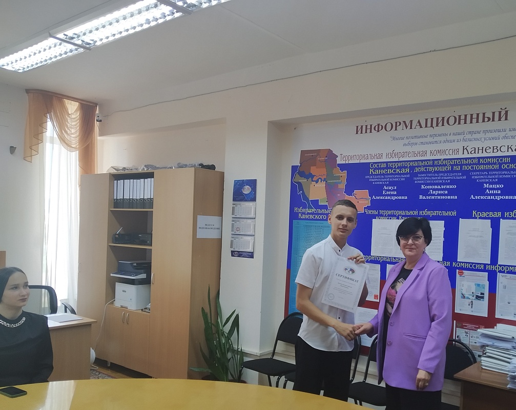 21 мая 2024 года председатель территориальной избирательной комиссии Каневская Елена Асаул вручила сертификаты избирательной комиссии Краснодарского края за успешное прохождение образовательного курса Молодежной школы правовой и политической культуры на территории муниципального образования Каневской район.